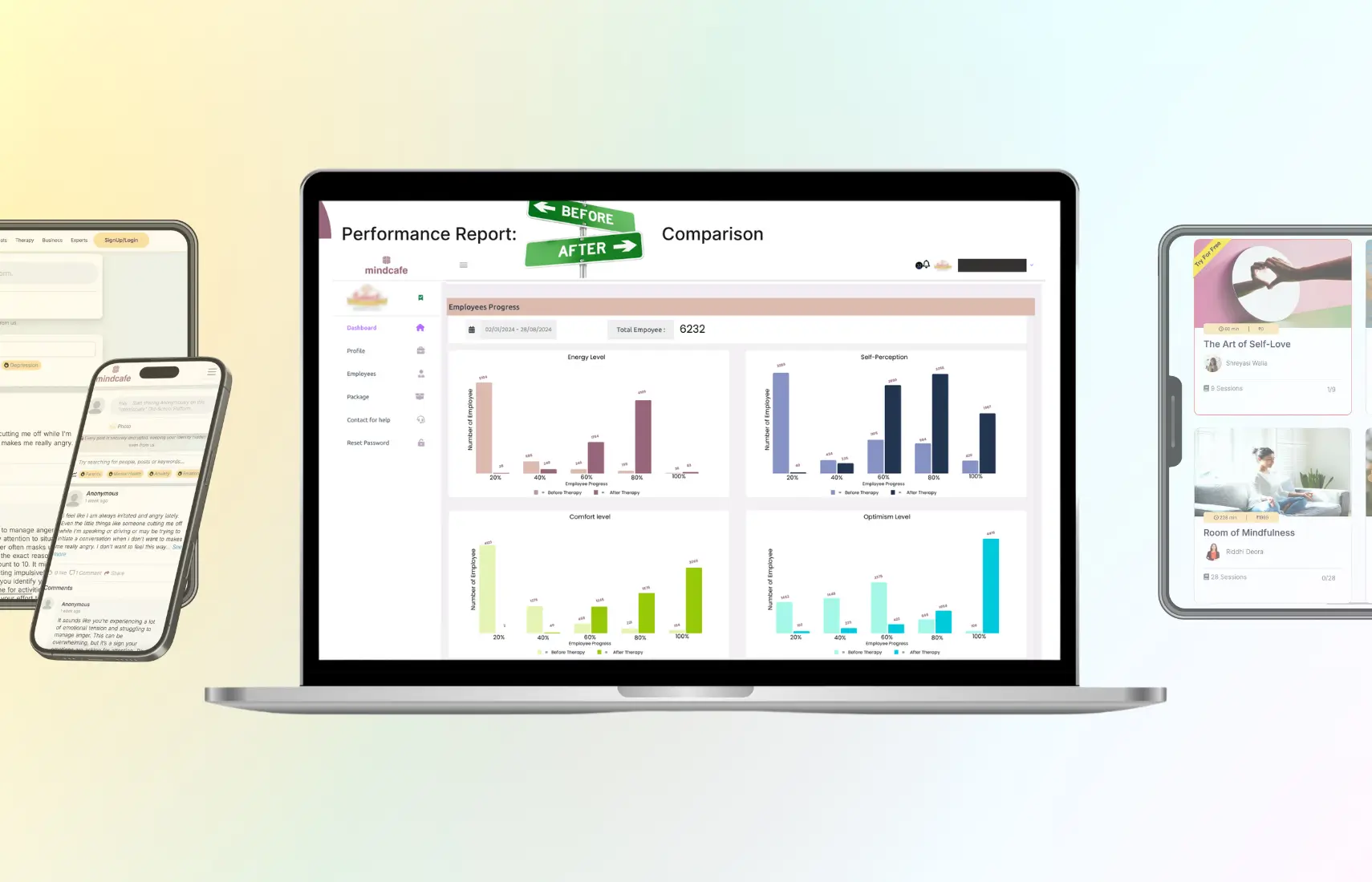 Mindcafe India provides access through a unique Employee Dashboard to all the employees of your organisation wherein they can access all the resources and services and track their progress.